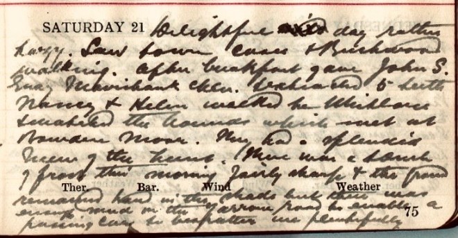 Wind E. colder: some flakes of snow at night: fair dry + bright all day. Shaved without gas [light?] at 7.10. Cycled to Castle Street + the Goslaw Green, Mavisbank, Dunsdale, Gib. + Lum. [Gibson & Lumgair, St Mary’s Mill], Bogle House, Yair + [Yair] Farm + Beechwood = 15.15. Had to go back to Yair after dinner + after 11/2 hours of surgery cases. Dubs’s pulse very irregular + some pulmonary oedema. Forgot to go to Hardie, Bridgelands at David’s request.