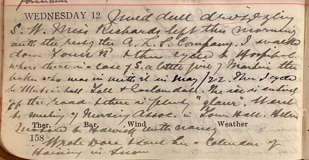Mild dull drizzling S.W. Miss Richards left this morning with the rest of the A.L.S. Company.1 I walked down Forest Road + then cycled to Hospital where there is a case of S.2, a little girl of Martin the baker3 who was in with it in May /22. Then I cycled to Whitmuirhall Toll + Goslawdale. The ice is entirely off the road + there is plenty “glaur”.4 Went to meeting of Nursing Association in Town Hall. Helen5 motored to Hawick with Nancy.6 Wrote Dora7 + sent her a Calendar of Haining in Snow.
