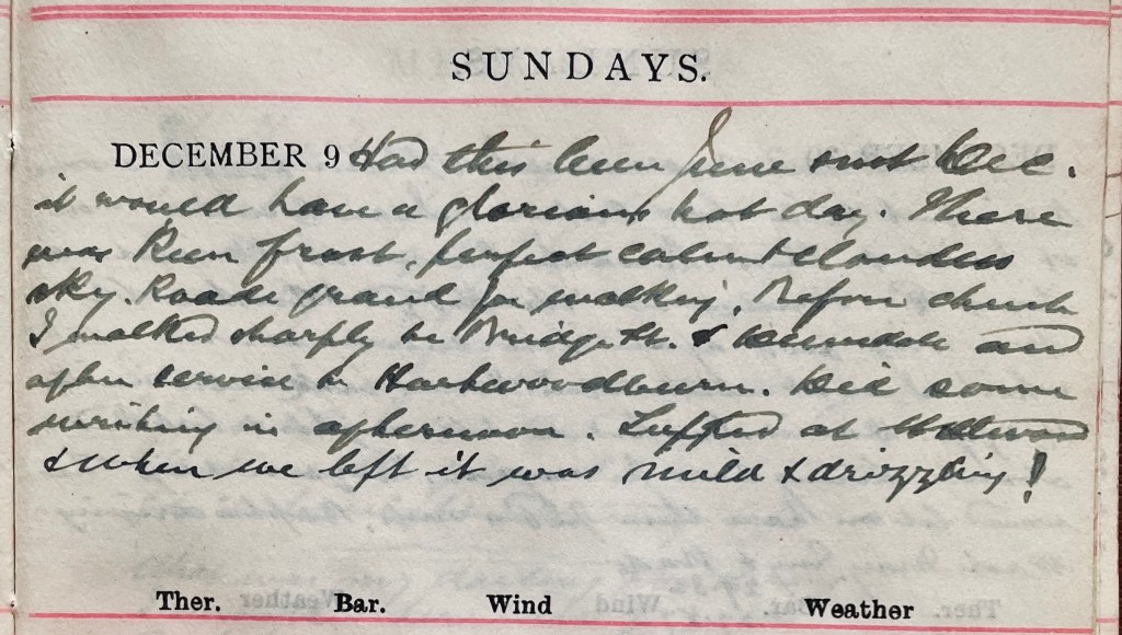 Had this been June not December it would have [been] a glorious day. There was keen frost, perfect calm + cloudless sky. Roads grand for walking. Before church I walked sharply to Bridge Street + Dunsdale + after service to Hartwoodburn.1 Did some writing in afternoon. Supped at Wellwood2 + when we left it was mild + drizzling.
