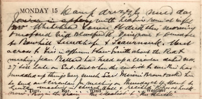 Still mild + damp. Some rain. Gave Chlor[oform] to Netty [?] Hogg at the Home while D. [Dr David Graham] operated. Saw some cases + started to motor to Ashkirk Manse to see the housekeeper Mclair + actually met her cycling in here! Gave her a good row. Dined at Farmers’ Club. Saw some more cases after. Dunlop at Club.