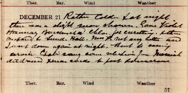 Rather colder + at night there was a slight snow shower. Gave Violet Hannay1, Buccleuch Road, chlor[oform] for curettage + then motored to Sunderland Hall. Mrs P [Plummer] not any better and I went down again at night. Went to evening service. Choir sang some selections from [The] Messiah. Addressed Xmas cards to post tomorrow.