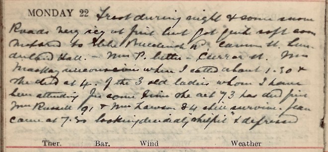 Frost during night + some snow. Roads very icy at first but got quite soft soon. Motored to Glebe, Buccleuch Road, Cannon Street, Sunderland Hall – Mrs P better1 – Curror Street. Mrs Mackay [sic] was unconscious when I called at 1.30 + she died at 42. Of the 3 old ladies whom I have been attending for some time since she aet 73 has died first. Mrs Russell, 91 + Mrs Lawson, 84 still survive. Jean came at 7.30 looking decidedly “shilpit”3 + depressed.