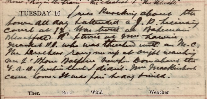 I was knocking about the town all day + attended a J.P. Licensing Court at 12. Was twice at Bateman’s1, Bleachfield Road + twice at Mrs Lawrie2, Market Place, who was [threatened?] with an M.C. The Duchess rang me up at night wanting me to ‘phone Balfour. Newton Don, about the Y.A.D. [?] but I didn’t. Mrs Mackintosh came home. It was fair today + mild.