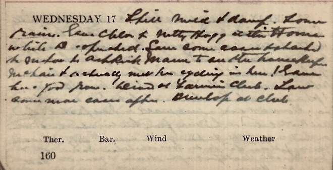 Still mild + damp. Some rain. Gave Chlor[oform] to Netty [?] Hogg at the Home while D. [Dr David Graham] operated. Saw some cases + started to motor to Ashkirk Manse to see the housekeeper Mclair + actually met her cycling in here! Gave her a good row. Dined at Farmers’ Club. Saw some more cases after. Dunlop at Club.