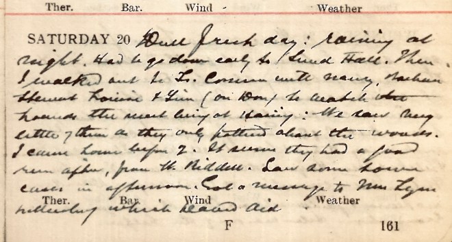 Dull fresh day: raining at night. Had to go down early to Sunderland Hall. Then I walked out to So[uth] Common with Nancy, Barbara, Stewart, Louise + Tim1 (on Don) to watch the hounds, the meet being at Haining: we saw very little of them as they only pottered about the woods. I came back before 2. It seems they had a good run after, from W Riddell2. Saw some town cases in afternoon. Got a message to Mrs Lyall3, Lilliesleaf which David did.