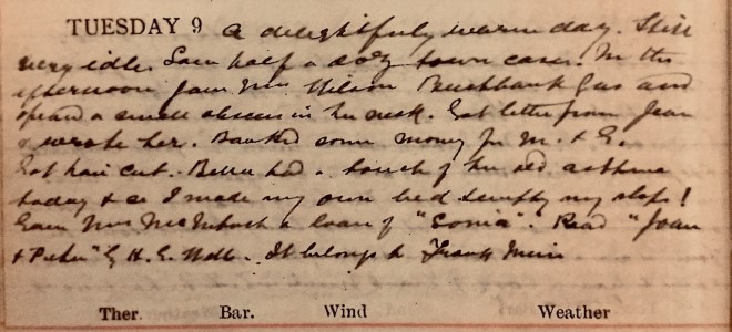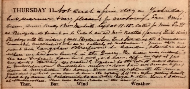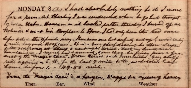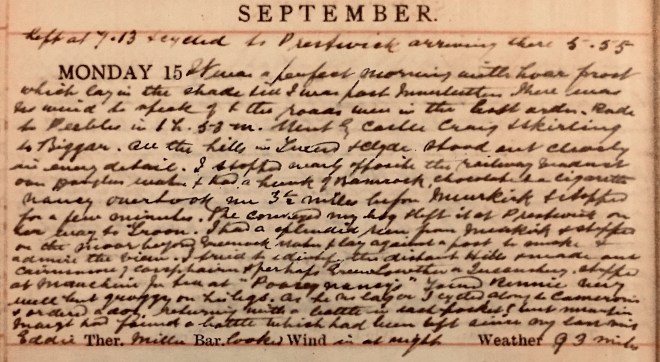 It was a perfect morning with hoar frost which lay in the shade till I was past Innerleithen. There was no wind to speak of + the roads were in the best order. Rode to Peebles in 1 h 53 minutes. Went to Castle Craig + Skirling to Biggar. All the hills in Tweed + Clyde stood out clearly in every detail. I stopped nearly opposite the railway viaduct over Douglas Water + had a hunk of Bannock, chocolate + a cigarette. Nancy overtook me 31/2 miles before Muirkirk + stopped for a few minutes. She conveyed my bag + left it at Prestwick on her way to Troon. I had a splendid run from Muirkirk + stopped on the moor beyond Greenock Water + lay against a post to smoke + admire the view + tried to identify the distant Hills + made out Cairnsmore of Carsphairn + perhaps Green Lowther or Queensberry. Stopped at Mauchline for tea at “Poosie Nancy’s” [Inn]. Found Rennie very well though quaggy on his legs1. As he no lager [sic] I cycled along to Cameron’s + ordered a dozen, returning with a bottle in each pocket but meantime Margaret had found a bottle which had been left since my last visit. Eddie Miller looked in at night2. 93 miles.