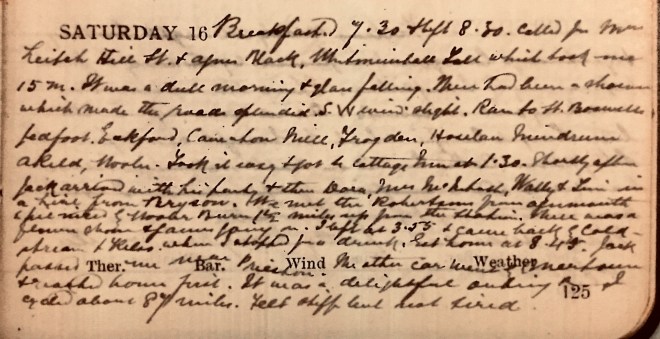 Breakfasted at 7.30 + left 8.30. Called for Mrs Leitch, Hill Street1 + Agnes Black, Whitmuirhall Toll which took me 15 minutes. It was a dull morning + glass [barometer] falling. There had been a shower which made the roads splendid. S.W. wind slight. Ran to St Boswells, Jedfoot, Eckford, Caverton Mill, Frogden, Hoselaw, Mindrum, Akeld [and] Wooler. Took it easy + got to cottage at 1.30. Shortly after Jack [Roberts] arrived with his party + then Dora [Muir], Mrs McIntosh, Wally + Tim [?] in a hire from Bryson. We met the Robertsons from Alnmouth + pic-nic by Wooler Burn 11/2 miles up from the station. There was a flower show + games going on. I left at 3.55 + came back by Coldstream + Kelso, where I stopped for a drink. Got home at 8.45. Jack passed me near Prieston. The other car went by near town + reached home first. It was a delightful outing + I cycled about 87 miles. Feel stiff but not tired.