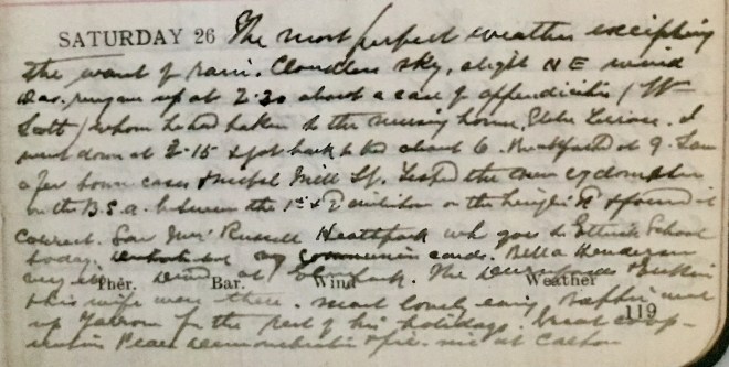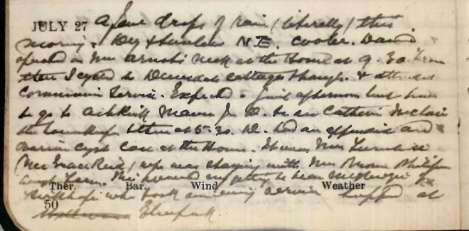 A few drops of rain (literally) this morning. Dry + Sunless N.E. Cooler. David [Graham] operated on Mrs Arnot’s neck at the Home at 9.30. From there I cycled to Dunsdale Cottages + [Dunsdale]Haugh + attended Communion Service. Expected a quiet afternoon but had to go to Ashkirk Manse for D. [Dr David Graham] to see Catherine Mclair1 [sic] the housekeeper + there at 5.30. D. had an appendix + an ovarian cyst case at the Home. It was Mrs Turnbull (nee Grace Reid2) who was staying with Mrs Brown, Philiphaugh Farm. This prevented me getting to hear McKenzie [sic] of Kirkhope who took our evening service3. Supped at Wellwood Elmpark.
