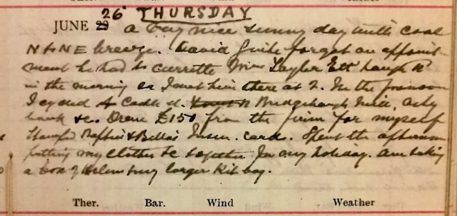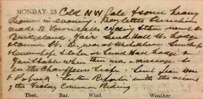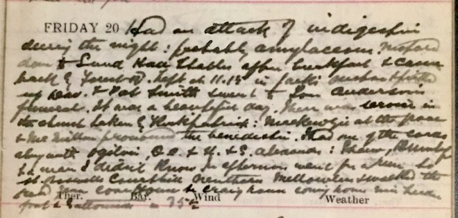Had an attack of indigestion during the night: probably amylaceous. Motored down to Sunderland Hall stables after breakfast + came back by Forest Road. Left at 11.15 in Jack’s motor + picked up Dav. [Dr David Graham] + Pat Smith1 + went to Tom Anderson’s Funeral2. It was a beautiful day. There was [a] service in the Church taken by Kirkpatrick3: Mackenzie4 at the grave + McMillan 5 pronounced the benediction. Had one of the chords with Ogilvie, Q.S. + U. + S. Alexander + a man I didn’t know6. In afternoon went for a run to St Boswells, Courthill, Nenthorn, Mellowlees + walked the road from Cove House to Craig House7 coming home via Leaderfoot + Gattonside [?] 35½.