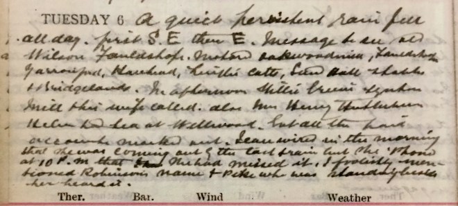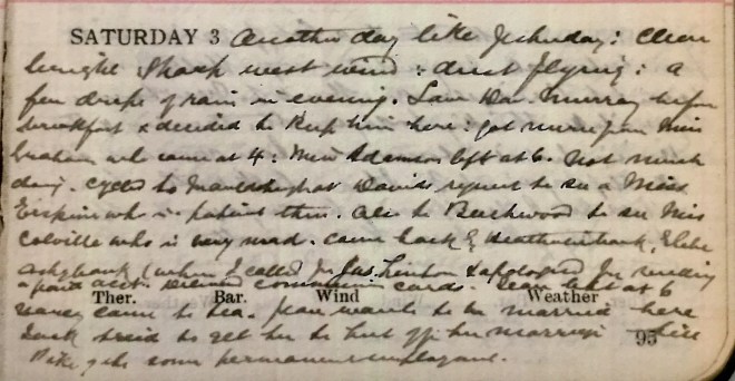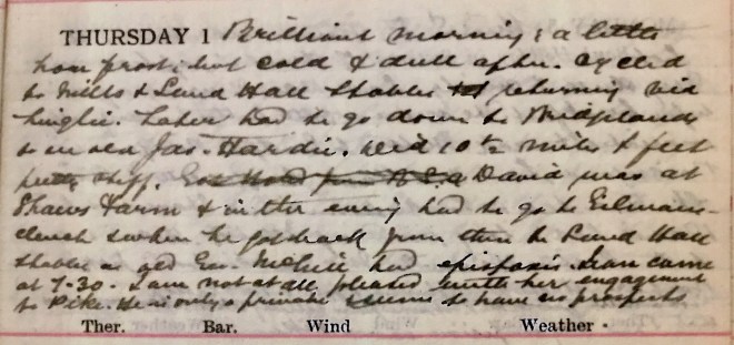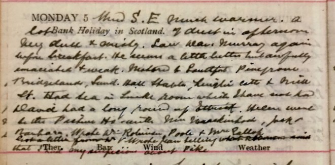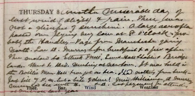 Another miserable day of east wind (slight) + rain. There was not a glimpse of sunshine. A large aeroplane passed over flying very low at 8 O’Clock. Probably the Handley Page from Manchester going north1. Saw D. Murray before breakfast + a few after, then motored to Ettrick Mill, Sunderland Hall stables + Bridgelands. Went to Divisional meeting at Newtown. It was held in the Baillie Memorial Hall + we got no tea. I had nothing from breakfast until 7 p.m. but a bite of cheese. Miss Williamson illegible words] had tea with H + D. Got payment for attending at Melrose last year.