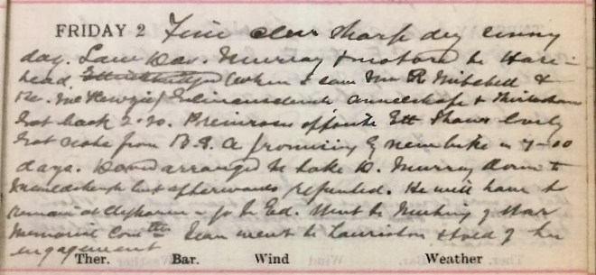 Another miserable day of east wind (slight) + rain. There was not a glimpse of sunshine. A large aeroplane passed over flying very low at 8 O’Clock. Probably the Handley Page from Manchester going north1. Saw D. Murray before breakfast + a few after, then motored to Ettrick Mill, Sunderland Hall stables + Bridgelands. Went to Divisional meeting at Newtown. It was held in the Baillie Memorial Hall + we got no tea. I had nothing from breakfast until 7 p.m. but a bite of cheese. Miss Williamson illegible words] had tea with H + D. Got payment for attending at Melrose last year.