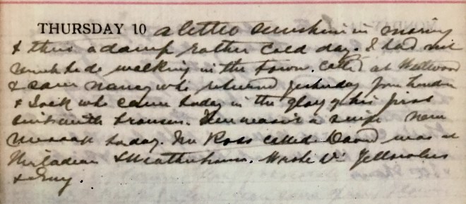A little sunshine in morning + thus a damp rather cold day. I had not much to do walking in the town. Called at Wellwood + saw Nancy who returned yesterday from London1 and Jock who came today in the glory of his first suit with trousers2. Mr Ross called3. David [Graham] was at Thirladean + Weatherhouse. Wrote Dr Yellowlees + Guy3.