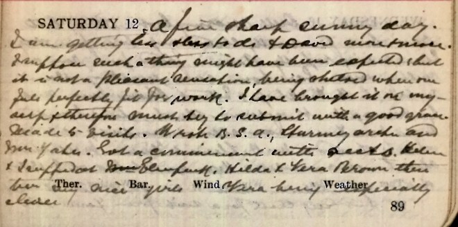 A fine sharp sunny day. I am getting lass + less to do + David [Graham] more + more. I suppose such a thing might have been expected but it is not a pleasant sensation being shelved when one feels perfectly fit for work. I have brought it on myself + therefore must try to submit with a good grace. Made 5 visits. Wrote B.S.A., Sturmey Archer + Mrs Yates. Got a [illegible] with accts. Helen [Muir] + I supped at Mrs Shawpark. Hilda + Vera Brown there two very nice girls1. Vera being especially clever.