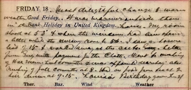 Most delightful change to warm weather. It was warmer outside than in the house. My room stood at 53o + when the windows had been open a little while the nursery rose to 56o. I saw a town list of 15 + worked away at the accounts Guy. Letter from Guy2 with payment for the cloth. Went to meeting of the War Memorial hut committee + was appointed secretary also meeting of full committee at 8. Had no food from tea at 2 till dinner at 9.15. Louisa’s Birthday gave her 2/- [shillings].