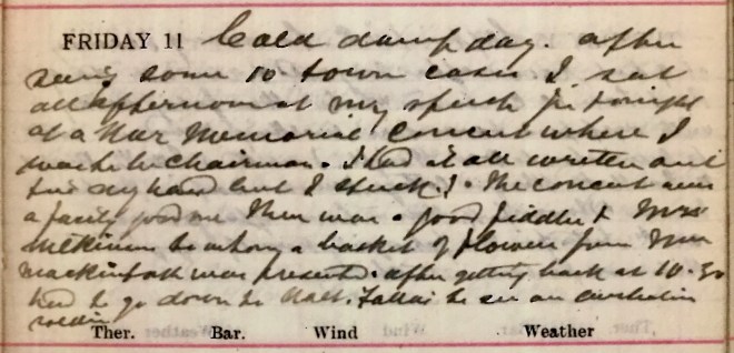 Cold damp day. After seeing some 10 town cases I sat all afternoon at my speech for tonight at a War Memorial event where I was to be Chairman. I had it all written out + in my hand but I stuck! The concert was a fairly good one. There was a good fiddler + Mrs Wilkinson to whom a basket of flowers from Mrs Mackintosh was presented. After getting back at 10.30 had to go down to Walt. Falla’s to see an Australian soldier.