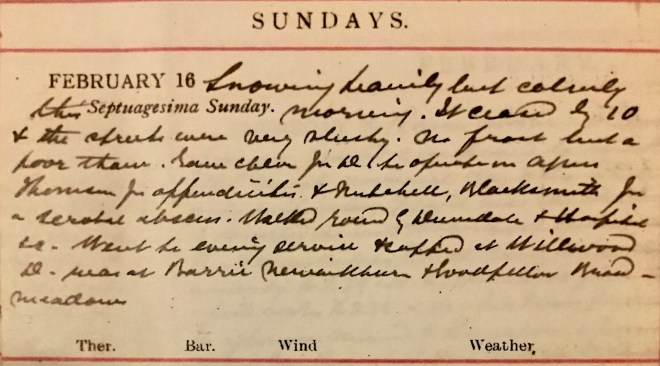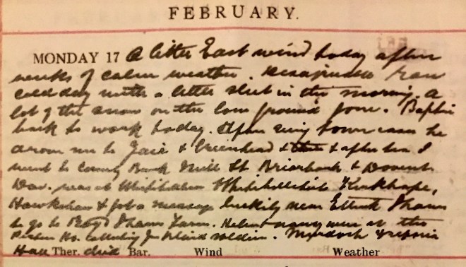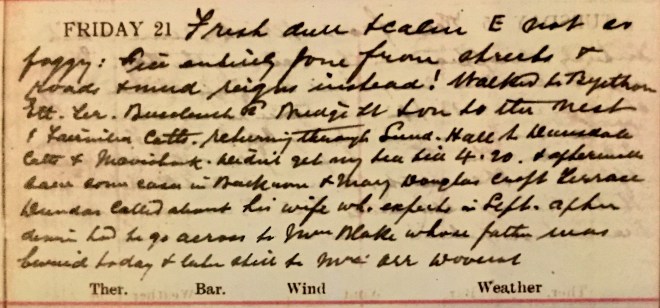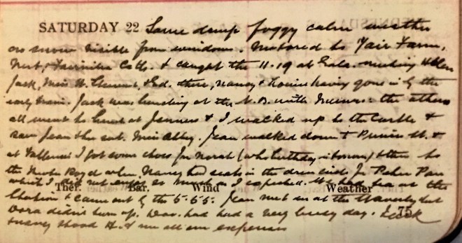 Same damp foggy calm weather no snow visible from window. Motored to Yair Farm, Nest + Fairnilee Cottages + caught the 11.19 at Gala, meeting Helen, Jack, Miss H Stewart [?] + Ed1. There, Nancy + Louise having gone in by the early train 2. Jack was lunching at the N.B. [North British Hotel] with Munro [?] : the others all went to lunch at Jenner’s + I walked up to the Castle + saw Jean + her sub., Miss Abbey [?]3. Jean walked down to Princes Street + at Vallance’s I got some chocs for Norah [Graham] (who birthday is tomorrow) + then to the Theatre Royal where Nancy had seats in the dress circle for Peter Pan which I did not enjoy as much as I expected. We had tea at the Station + came out by the 5.55. Jean met us at the Waverley [?] but Dora didn’t turn up4. Dav [Dr David Graham] had had a very busy day. Jack + Nancy stood H [Helen] & me all our expenses.