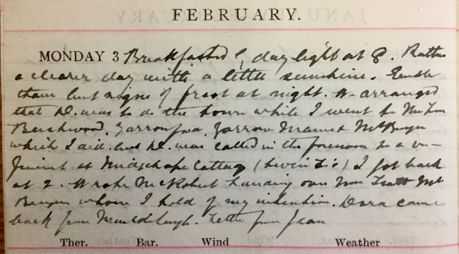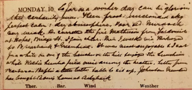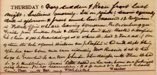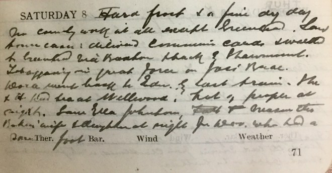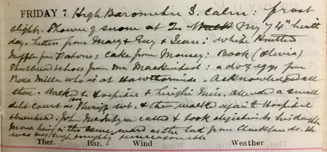 Fresh snow during the night + a pretty heavy fall from 4 to 6. No frost but snow lying out of traffic. Saw some town cases walking. No County work. Dav. [Dr David Graham] met Fraser at Galashiels + at 5 he operated Flora Harper for appendicitis. Her appendix was swollen, adherent + full of pus. I got a late message to And[rew] Brown, Dunreay1 + didn’t get my dinner till after 8. H. + D. went to the picture house with Nancy2.