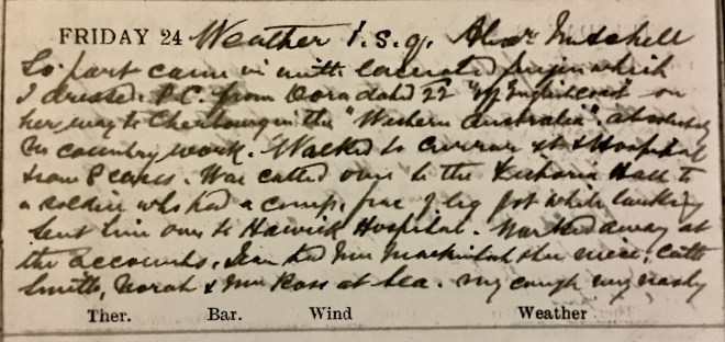 Weather I.S.Q.1 Alexr Mitchell [?] came in with lacerated finger which I dressed. P.C. [post card] from Dora dated 22nd off English coast on her way to Cherbourg in the “Western Australia”2. Absolutely no country work. Walked to Curror Street + Hospital + saw 8 cases. Was called over to the Victoria Hall to a soldier who had a compound fracture of leg got while walking [?] Sent him over to Hawick Hospital. Worked away at the accounts. Jean [Muir] had Mrs Mackintosh + her niece, Cath Smith, Norah + Mr Ross at tea. My cough very nasty.