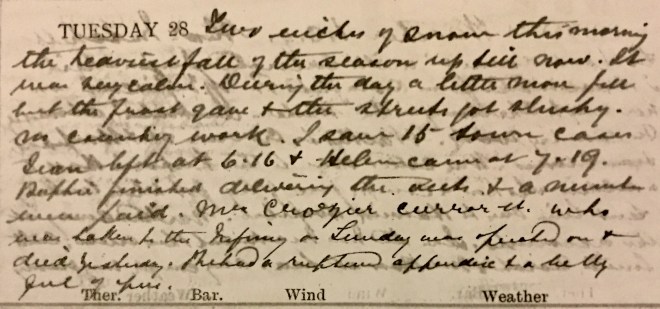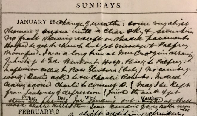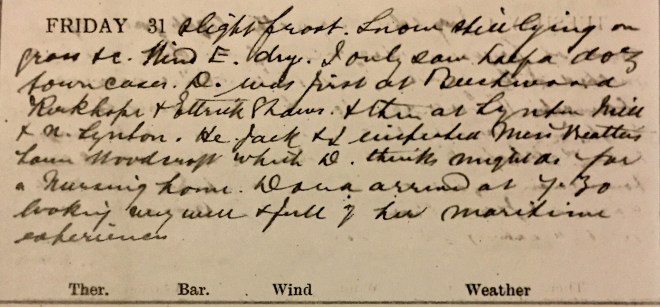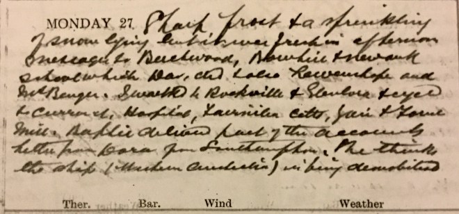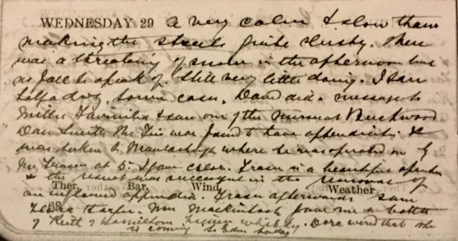 Weather I.S.Q.1 Alexr Mitchell [?] came in with lacerated finger which I dressed. P.C. [post card] from Dora dated 22nd off English coast on her way to Cherbourg in the “Western Australia”2. Absolutely no country work. Walked to Curror Street + Hospital + saw 8 cases. Was called over to the Victoria Hall to a soldier who had a compound fracture of leg got while walking [?] Sent him over to Hawick Hospital. Worked away at the accounts. Jean [Muir] had Mrs Mackintosh + her niece, Cath Smith, Norah + Mr Ross at tea. My cough very nasty.