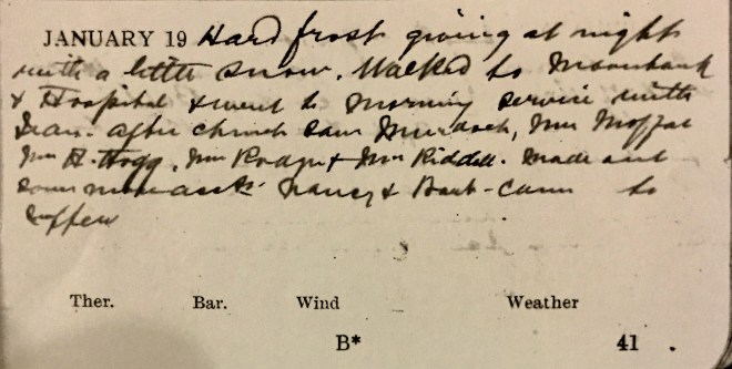 Same dull foggy weather but no actual rain. There apparently had been a sprinkling of snow in the early morning but there was nothing left at daylight but traces of slush on the pavements. I saw a town list of a doz. cases including the Hospital cycling + went on to Sunderland Hall + Ovenscloss returning by Sim & Co. + Kilncroft1. Put up some County accounts. Dav. [Dr David Graham] was at a Pension Board at Galashiels, Baptie driving him in the Swift as the Ford is still at Stow2.