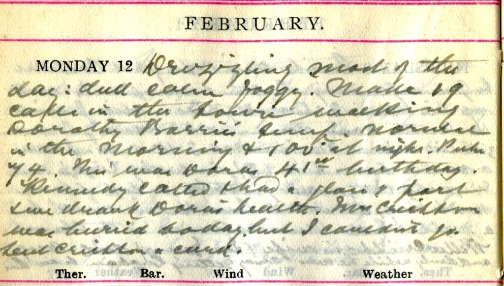 Drizzling most of the day : dull calm foggy. Made 19 calls in the town walking. Dorothy Barrie’s1 temperature normal at night + 100o at night. Pulse 74. This was Dora’s 41st birthday.2 Kennedy3 called + had a glass of port + we drank Dora’s health. Mrs Crichton was buried today but I couldn’t go so sent Crichton a card.