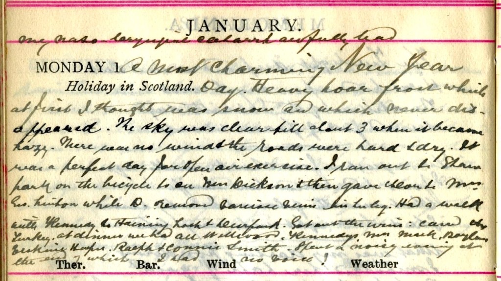 Most charming New Year’s Day. Heavy hoar frost which at first I thought was snow and which never disappeared. The sky was clear till about 3 when it became hazy. There was no wind + the roads were hard + dry. It was a perfect day for open air exercise. I ran out to Shawpark on the bicycle to see Mrs Dickson1 + then gave Chlor[oform] to Mrs Geo. Linton2 while Dav.3 removed varicose veins in her leg. Had a walk with Kennedy4 to Haining Loch + Deerpark. Got out the wine : carved the turkey. At dinner we had all Wellwood5, Kennedys6, Mrs Mack7, Boylan8, Erskine Harper9 [and] Ralph10 + Connie Smith.11 Spent a merry evening at the end of which I had no voice!