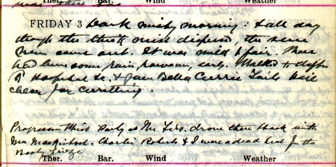 The 96th birthday1 has come + gone. The old man got half a dozen wires + many letters + presents + some callers. I met Lizzie2 + Nancy3 at 12.20 train. Poor Lizzie very thin + breathless.