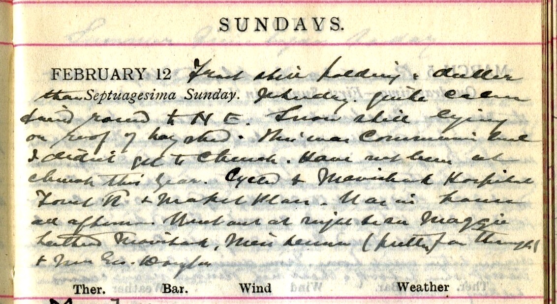 Snow lying again + a little falling this morning. There was some frost too + the roads + pavements were very slippery. There was a strongish S.W. wind + most of the snow disappeared. Two operations for appendicitis at Viewfield (Mrs Grandison + after Wilson1) which took from 11.15 till 1.15. Before that I walked to Hospital, Dunsdale, Mavisbank +c + in afternoon cycled to Ettrickbridgend + Beechwood nearly 16 [miles]. I had to walk Ettrick Road + Oakwoodmill Brae but rode Fauldshope + Hutlerburn. Met Dittmar2 + Kennedy3 re Hospital. Peggy Hunnam4 died at Hospital. Mrs Simpson5, Wellwood, fell + hurt her legs.